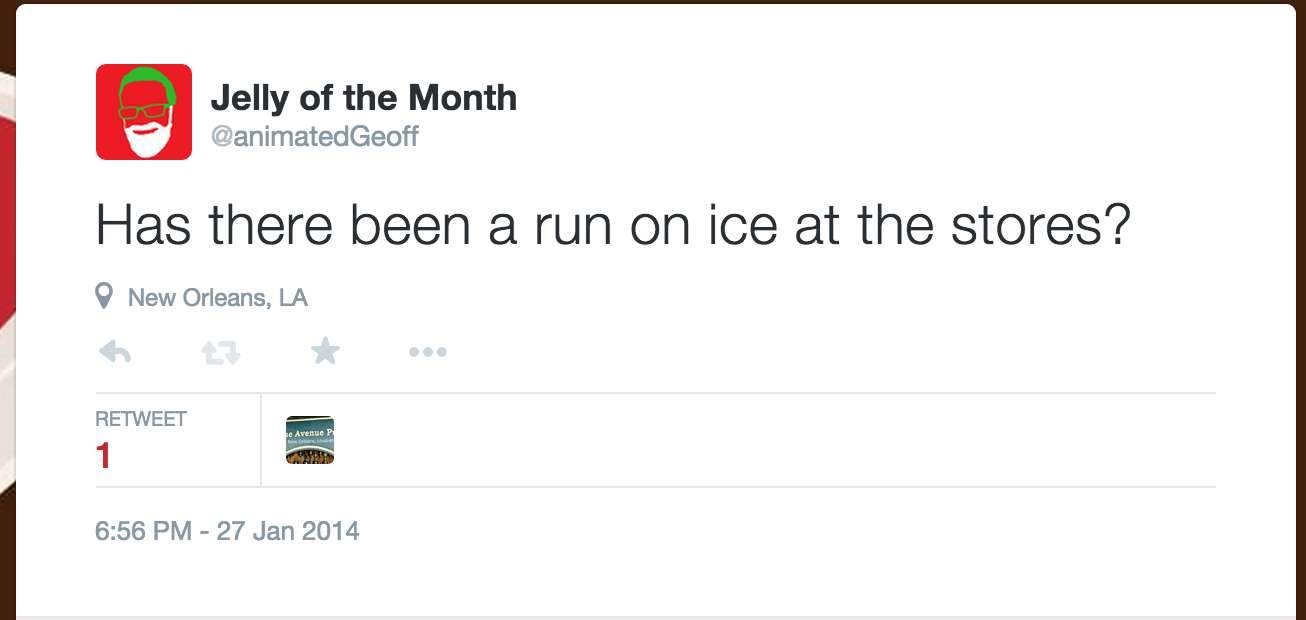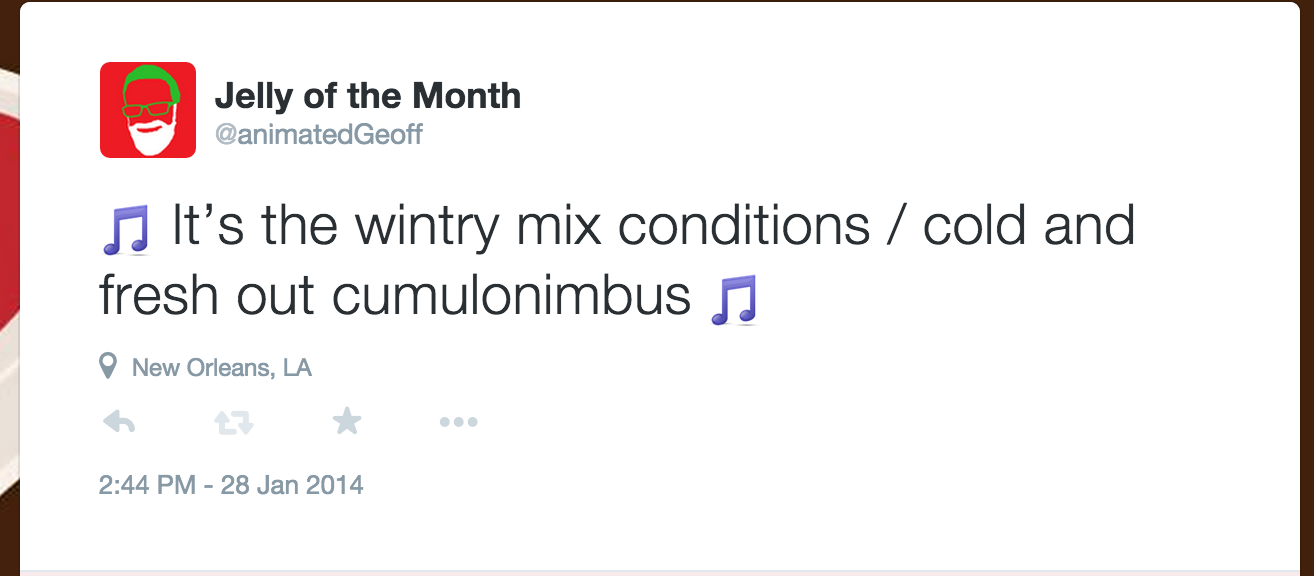Wow! This tweet so accurately describes the weather in New Orleans on January 28th! It even tacks on a little joke using a parody of R. Kelly lyrics! This guy's on the ball!