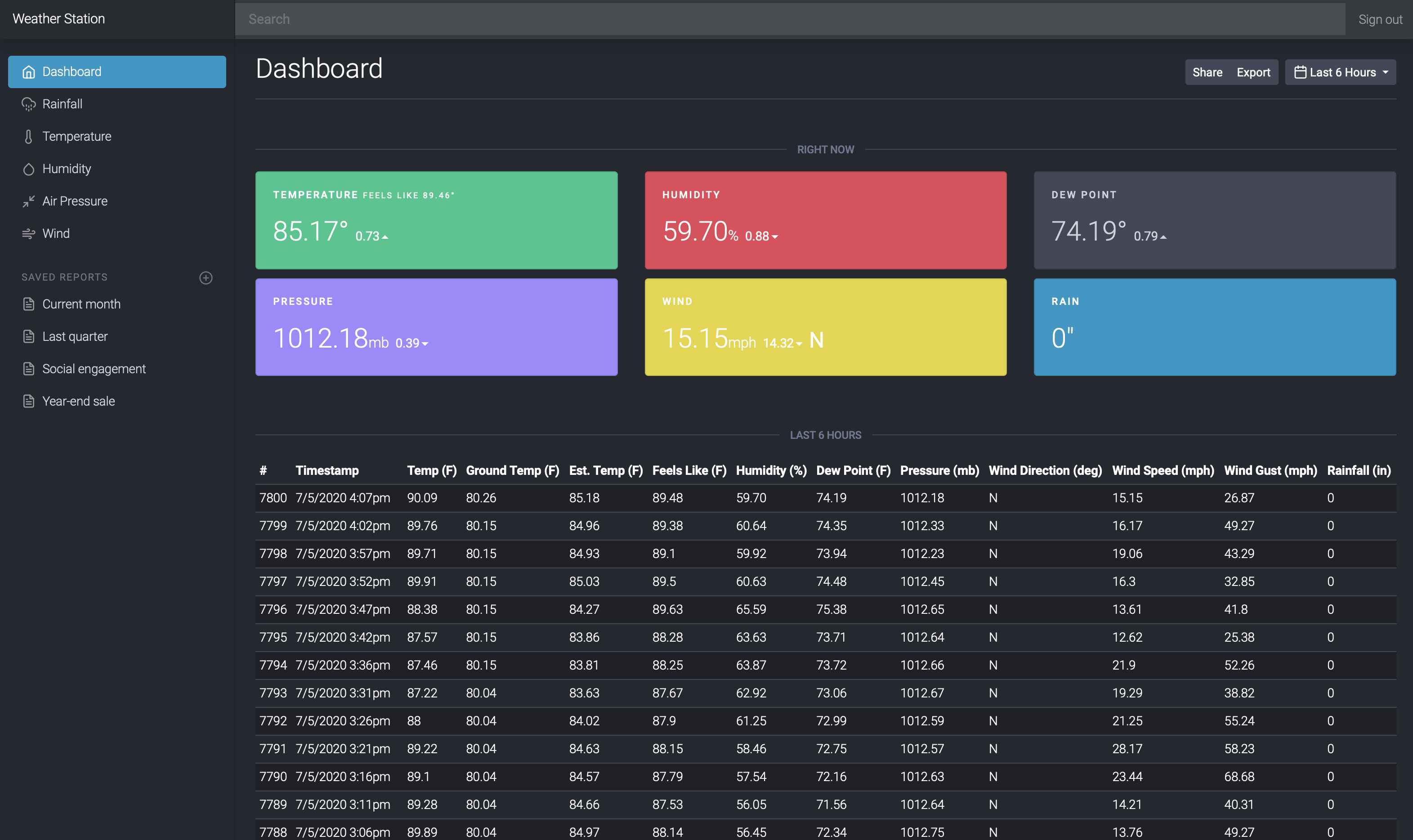 This means we've got our weather station up and running, bringing in data! Cool! At this point though, the only way to see the current weather conditions is to do a database query manually in a database tool or something, which... isn't very user-friendly. The good thing is, all of our data is in a MySQL (well, MariaDB technically) database, which means we can access the data from pretty much anything these days. I decided to build a simple little PHP web app to display, visualize, and query the weather data. I used a free Bootstrap "admin dashboard" template for the frontend and customized it because I love dark mode, baby!
