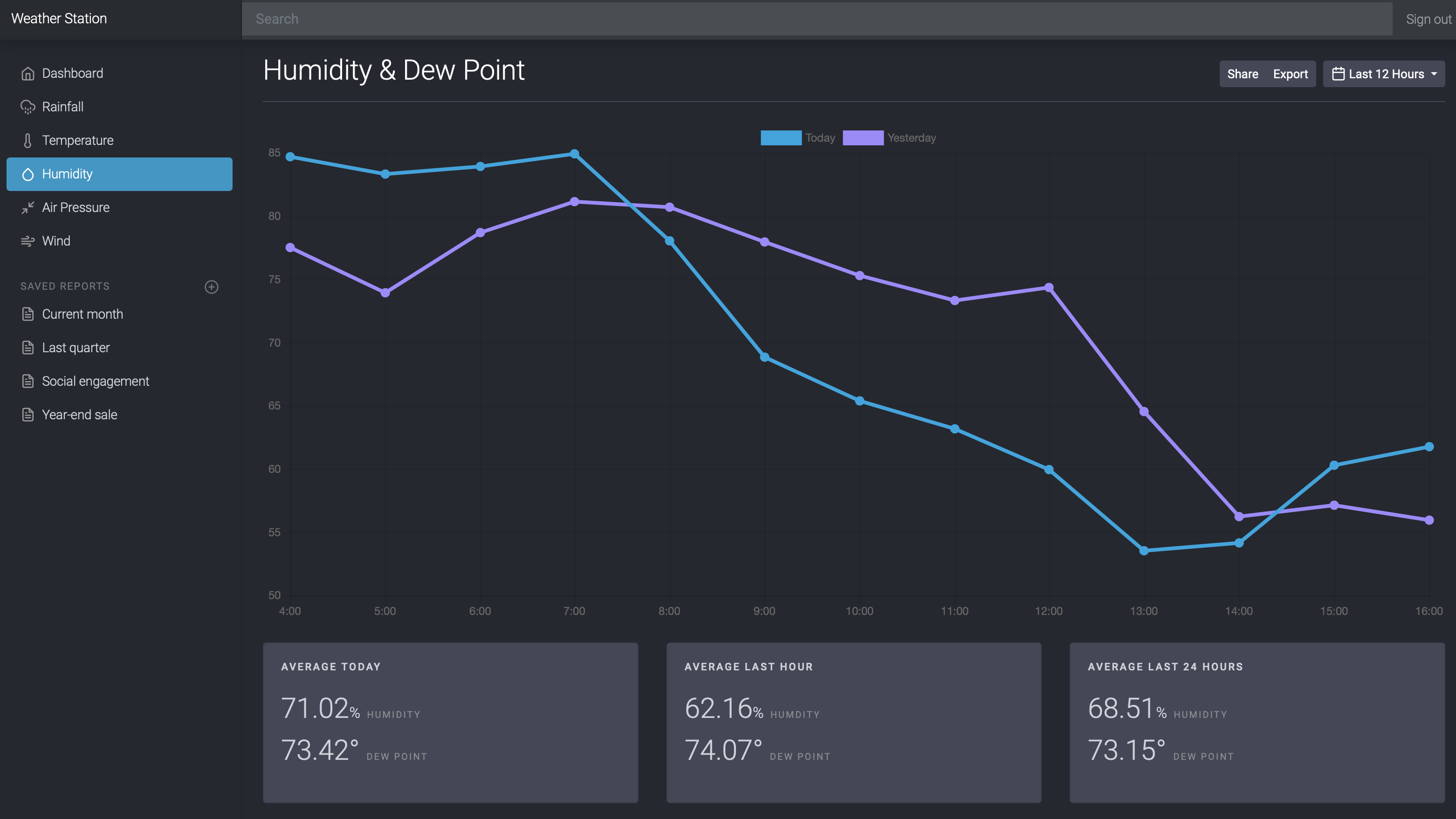 I'm a web developer by trade, so I went further with this dashboard, creating graphs and stuff for each data point, that can be viewed by predetermined time frames like "Last 12 hours" or "Yesterday", or a custom date range. Here's a few: