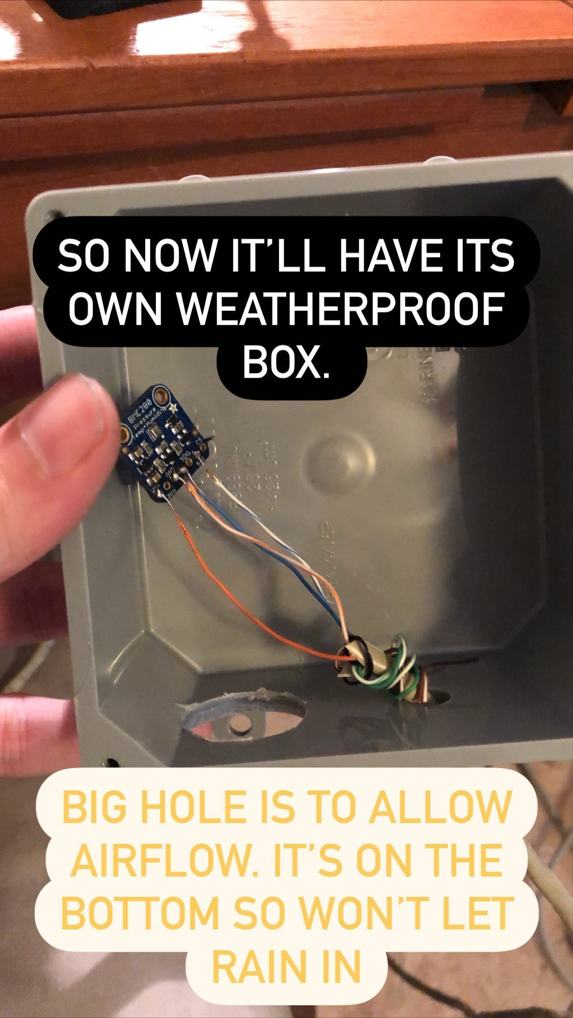 I did some googling and came across this guide for building a weather station with a Pi. So, I ordered all the instruments they suggested, ordered some perf-board and terminal connections, and resistors from DigiKey, and bought some outdoor junction boxes from Lowe's and waited to get started. I followed the guide pretty much exactly, so I'm not gonna go into great detail on it, but I learned a few things and made some modifications and additions, so I'm gonna share those. I also documented the build on my Instagram story, so the only photos I have are in portrait and have colorful text printed on them, but whatever. That's what posting in 2020 is.