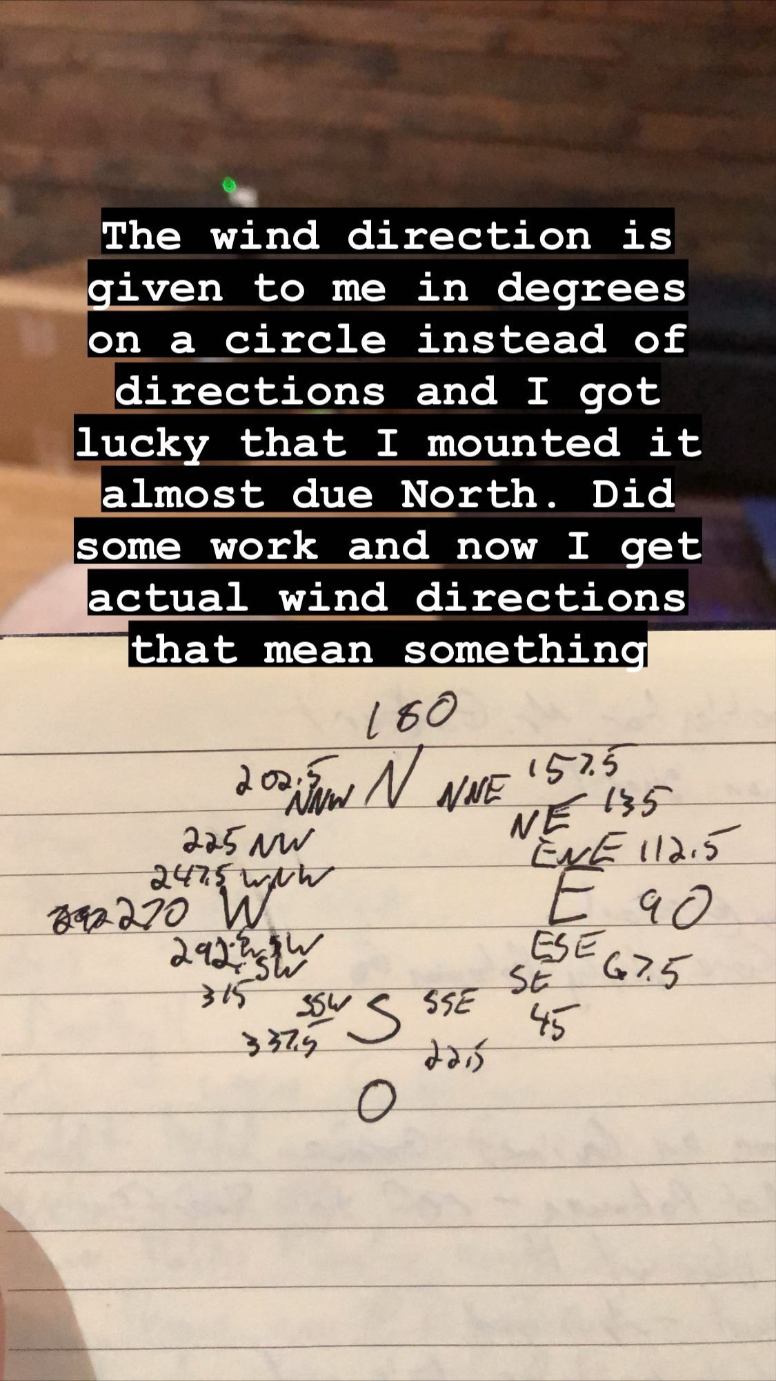 And just to make things look nicer and more human readable, I convert those degrees into compass directions. I had to determine where 0º and 180º were pointing when I mounted the system on my house. I happened to put 180 pointing north, so then I knew 0 was south. Then I spun the vane to point west, got the value for that and with those three degrees, I could derive the remaining directions.