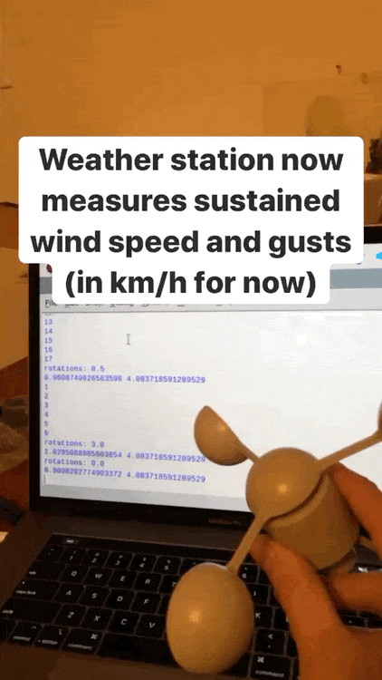 So, how does the anemometer (wind speed sensor) work? It's pretty cool! So, it has three arms with little cups on them that catch the wind and make the top of the device spin, kinda like when they made pinwheels out of soda cans for the sensors in Twister. Inside the sensor is a reed switch. A reed switch is basically a small cylinder with some metal in it. When a magnet is placed near it, the metal moves and completes the circuit, like a switch. So, as the cups spin, they're moving a little magnet around. Every time the magnet passes the reed switch, it "presses" a "button" basically. So, we make the Pi listen for a button press from the anemometer (which happens on every half turn) and then we take the number of "presses" in a given time period and divide by 2 to get the number of full rotations. Then, knowing the radius of our sensor (9cm, according to the data sheet), we can calculate how fast the sensor moved those 9cm in the specified time period (5mins is what I have mine set to). Then I do some basic conversation to put that in miles per hour since our country refuses to anything the normal way. We take all the readings in that 5min period and get the mean value to get our sustained wind speed. Then we take the maximum value from those readings and that gives us our wind gust value. Note: you do need to calibrate the sensor. Luckily, other people have figured this out and you can just multiply your values by 1.18 to get accurate readings.