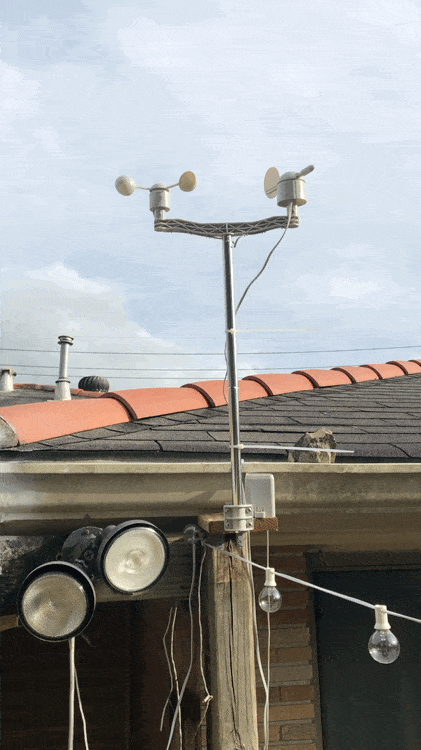 The rain meter is a lot easier. It also has a single reed switch in it. Inside the meter is a little bucket on a little hinge. When the bucket fills up with water, it tips over dumping out the rain and trips the reed switch, acting as a button press like on the anemometer. According to the data sheet for the rain meter, the bucket dumps when it has 0.2794mm of rain in it, so knowing that, we just multiply the number of bucket dumps by that and bingo bango we know how much rain has fallen in a given time period (again, 5mins for my system). Yes, that does mean if you receive less than 0.2794mm of rain in that 5min period, your system will not know because the bucket hasn't tipped yet. That sucks if you're like me and crave decimal places, but them's the breaks.