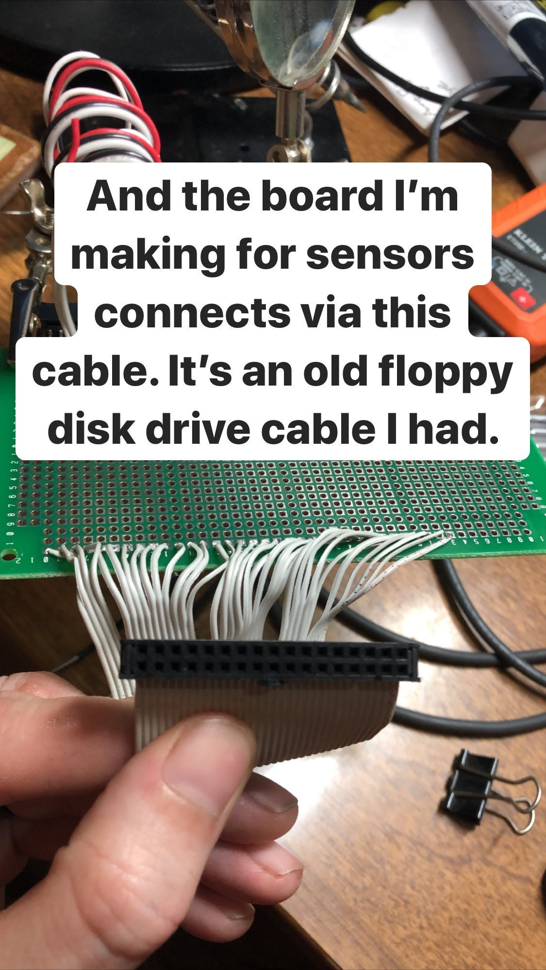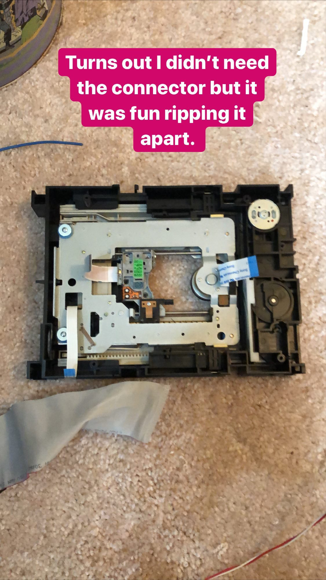 The first thing you're gonna do is prep your Pi with Raspbian (the Linux OS for it) and there's half a million guides on this everywhere already, so you figure it out. Instead of using a breadboard for prototyping and then using a HAT to put everything together, I got a little 6in perf board to just solder everything onto. If you're not willing to test in production, you're not willing to engineer! (Please do not tell my job this). My original plan was to put an old IDE connector on my board and use a computer IDE cable to connect it to the Pi. So, I found an old broken disc drive for the original XBOX lying around and stole the IDE connector off of it. I hoard electronics, broken or working, for just such occasions. Turns out IDE cables are weird and my pins were getting crossed, so I eventually scrapped that idea and hardwired a floppy disk ribbon cable to my board and i use that to plug into the Pi.