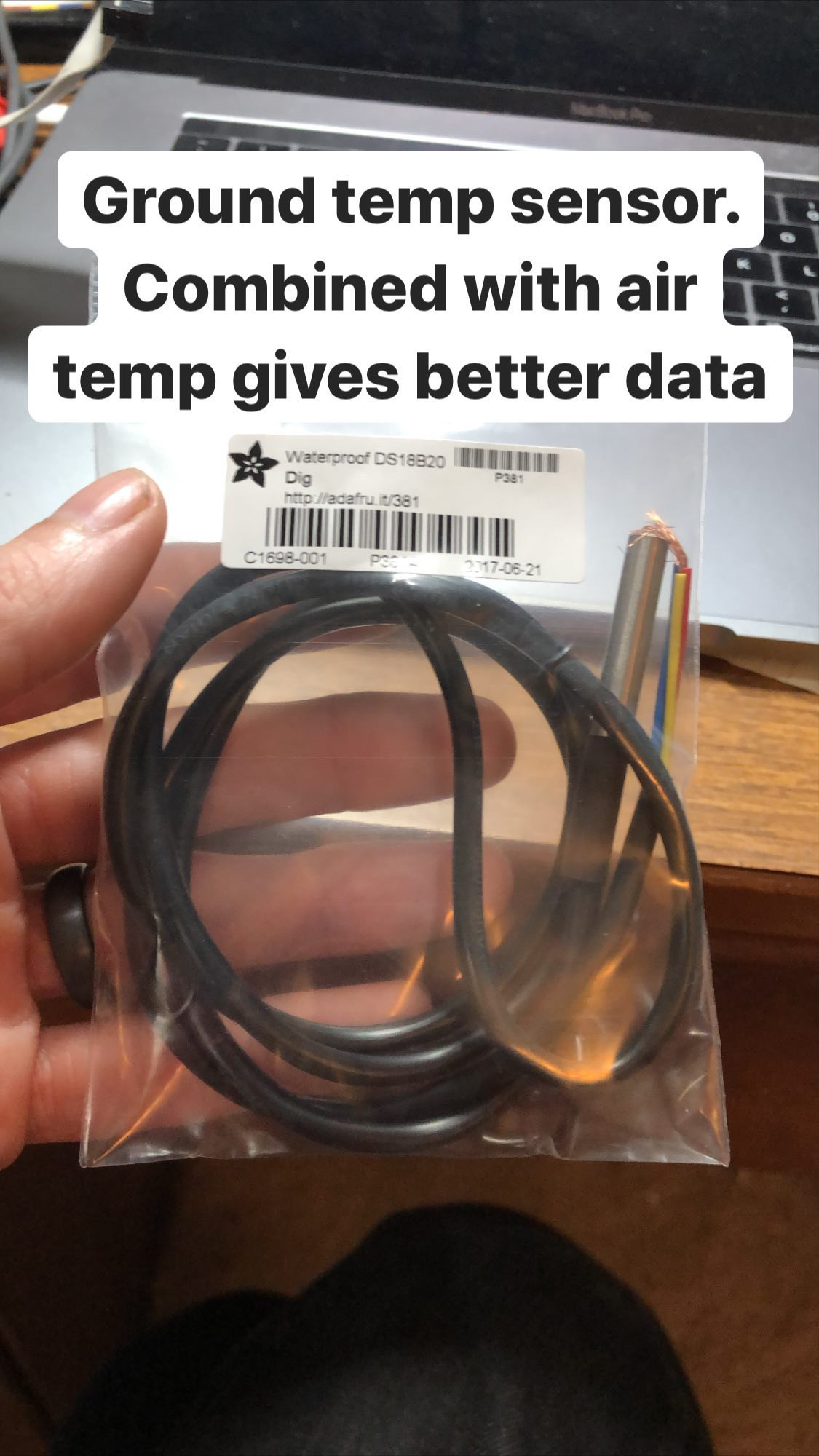 In addition to air temperature, I also have a ground temperature sensor. Air temperature tends to fluctuate a lot, and ground temperature tends to be steady, but is significantly cooler. It's nice to see the data, but I've been taking the mean of the air and ground temperatures to derive a "true" temperature. I've found that the more consistent ground temperature kinda normalizes the wild air temperature and gives me pretty accurate values when compared to both DarkSky and NOAA's weather apps. The ground temp probe connects via terminal blocks and you just shove it into the ground outside.