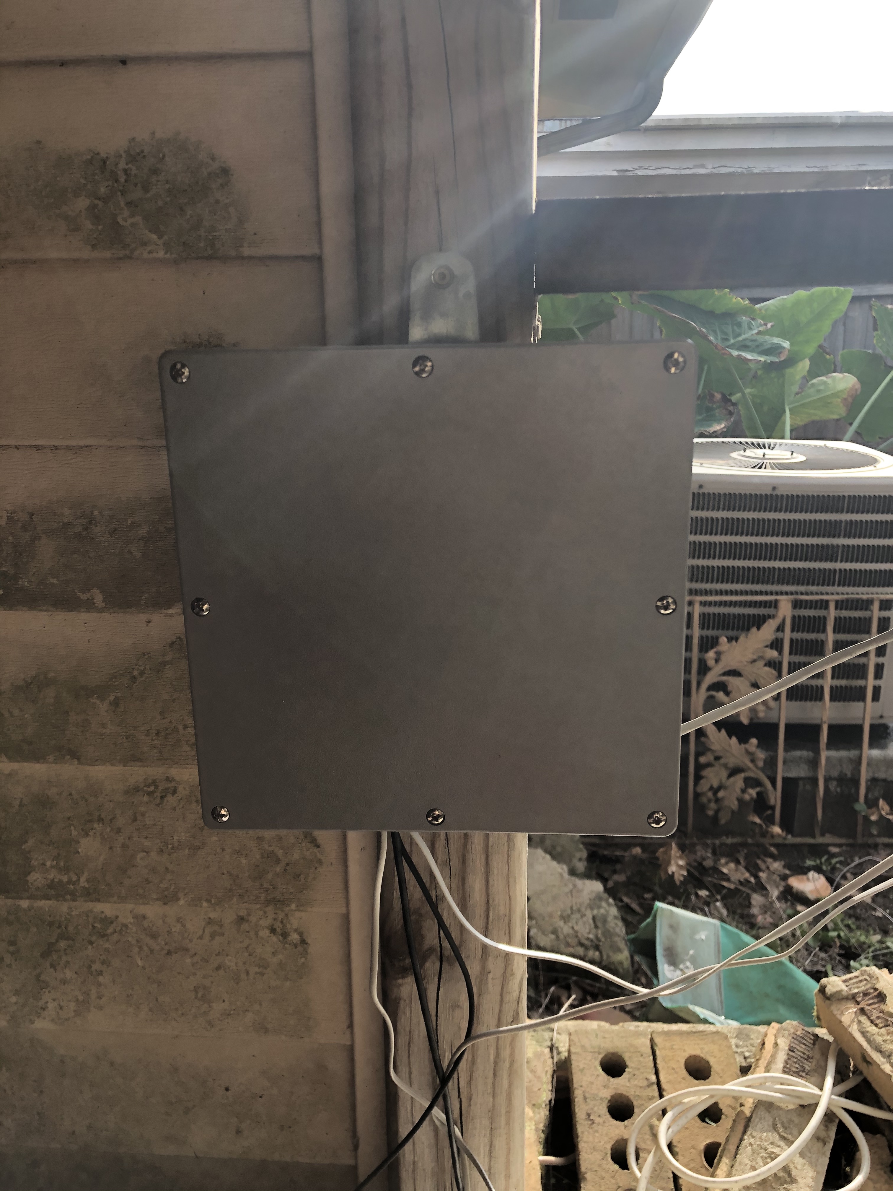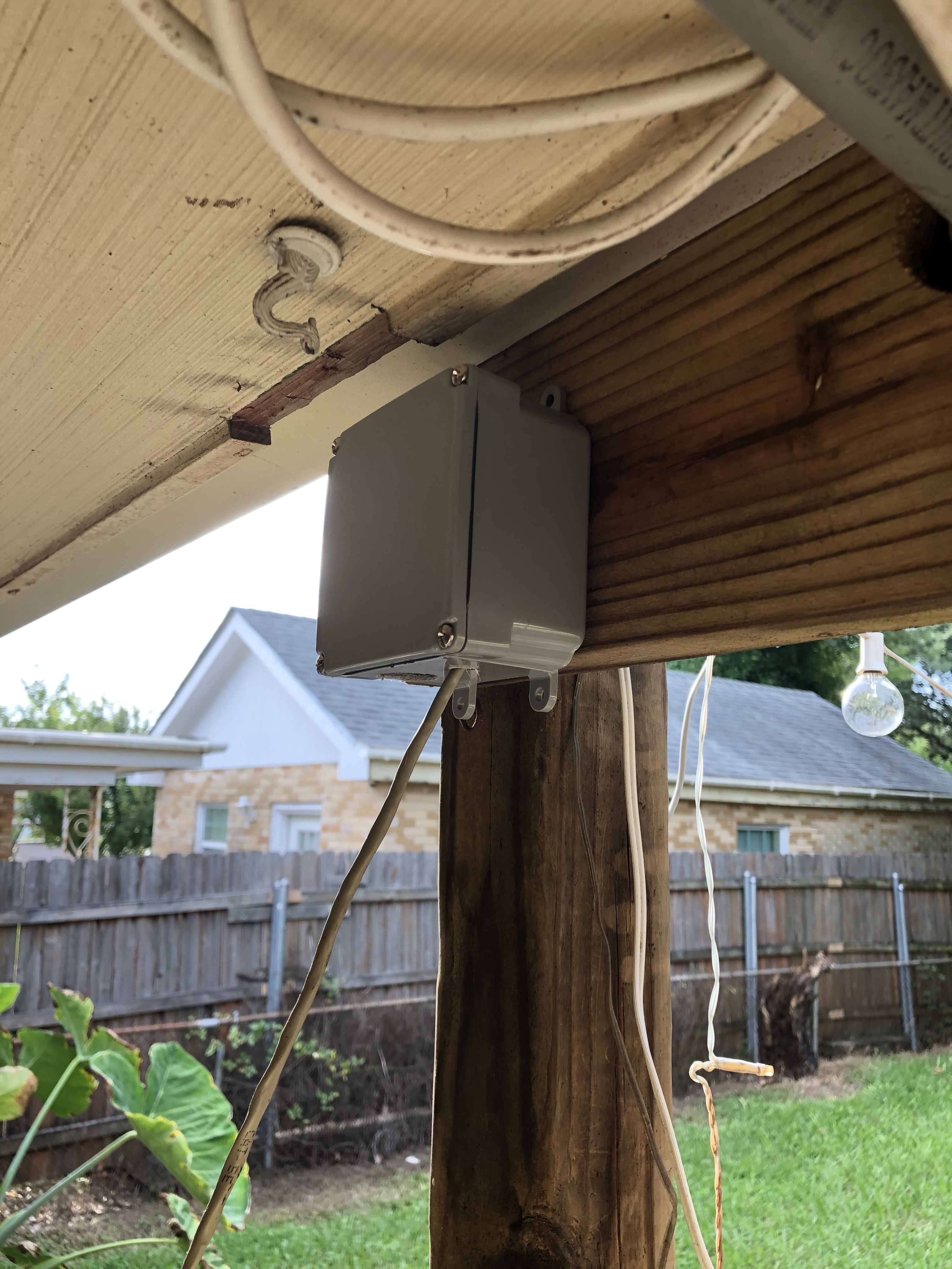 So now we've got ambient temperature, ground temperature, relative humidity, air pressure, wind speed and direction, and rainfall being measured. Time to mount the sucker in a weatherproof box and install it outside! I bought an 8x8in junction box from Lowe's to house the Pi and my board. I used velcro to attach it, but screws would probably be best, but I just used what I had around. I also used a little 4in junction box to house the BME combination sensor. The wind instruments come with a cool T-shaped pole that you can mount to your house or a fence or even a larger pole. Whatever works for you. I suggest putting it somewhere where it won't be obstructed by another house or your roof or the fence. Somewhere high up. Rain meter obviously should have a very clear view of the sky and not have runoff from your roof affect it. I mounted mine up high on the same thing as the wind meters.