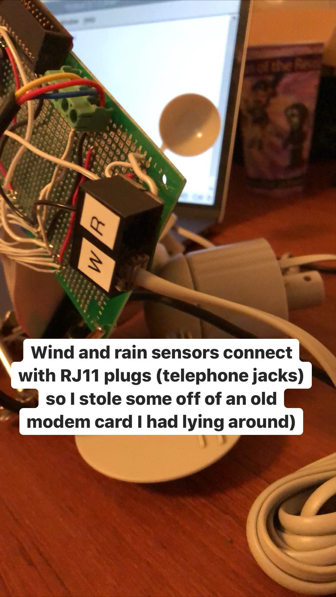 The wind sensors and rain meter all connect via standard RJ11 plugs -- the very same used on landline telephones, for those of you born in the 1900s. With a global pandemic happening and RadioShack all but not existing anymore, buying some RJ11 jacks ain't exactly easy. I could've ordered some from DigiKey, but I didn't wanna wait 4 or 5 days for them. I considered just hacking the plugs off the sensors' wires, but decided against it so that they'll be easy to disconnect if I ever move the weather station. Then I remembered my stockpile of obsolete and broken electronics. I found an old dial-up modem card for a PC in my collection and it just so happened to have two RJ11 jacks on it. Since I'm terrible at desoldering, I used my Dremel and cut them out of the circuit board because who gives a shit? I only needed two -- the wind sensors plug into each other and connect to the board with a single RJ11 plug.